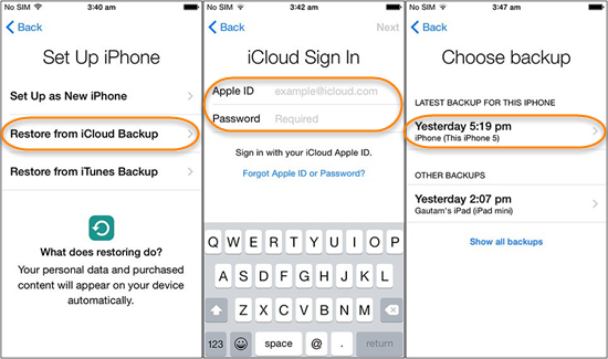 3.Pick up your new iPhone and “Slide to set up”. Select “Restore from iCloud Backup” and sign into your iCloud account.