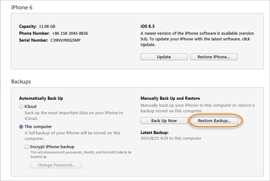 4.In your new iPhone control panel, click “Restore Backup…”. Choose your old iPhone’s backup file and restore it to your new iPhone 6s or 6s Plus.