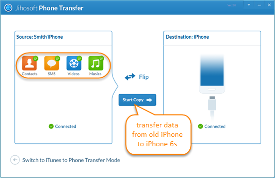 Transferring data to a new iPhone with iTunes or iCloud can be a time consuming process. We suggest you use Jihosoft Phone Transfer. With it, you can directly transfer contacts, SMS, photos, videos, music and more from iPhone 4s/5/5s to iPhone 6/6 Plus/6s/6s Plus in just one click without the need of backup.