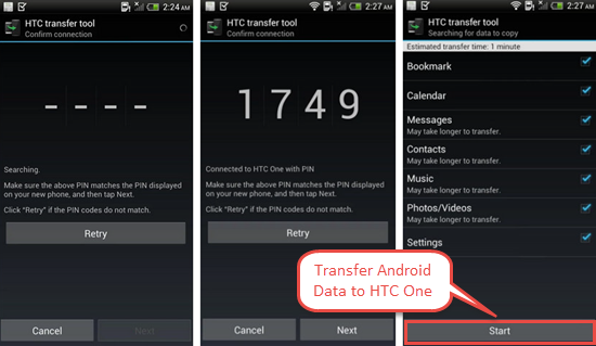 3. Open the tool on your old Android, you will see a PIN. Make sure it matched the PIN displayed on your new HTC phone, and then tap “Next”.