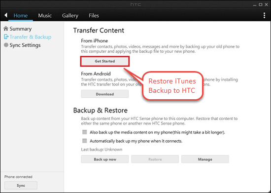 1. Run HTC Sync Manager, click “Home” > “Transfer & Backup”. Then click the “Get Started” button.