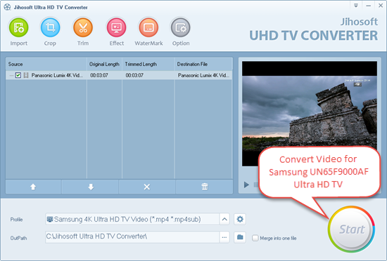 If you buy Samsung 65” F9000 4K Ultra HD TV, and can’t wait to enjoy your favorite videos on this great television, you’d better get Jihosoft Ultra HD TV Converter. This Samsung UHD TV Converter provides an efficient way to convert SD, HD and 4K video to Samsung UN65F9000AF 4K TV format. You can convert video files taken by 4K camcorders, digital cameras, mobile phones or tablets. The created video will keep 4K resolution (3840 x 2160 or 4096 x 2160) and can be played on Samsung UN65F9000AF as well as other 4K Ultra HD TVs.