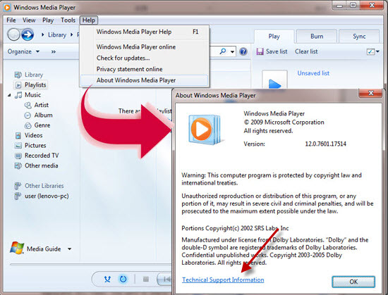* On the About Windows Media Player dialog box, click Technical Support Information.